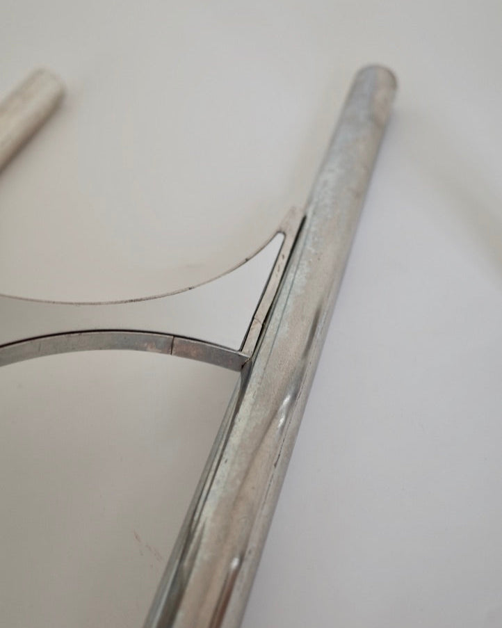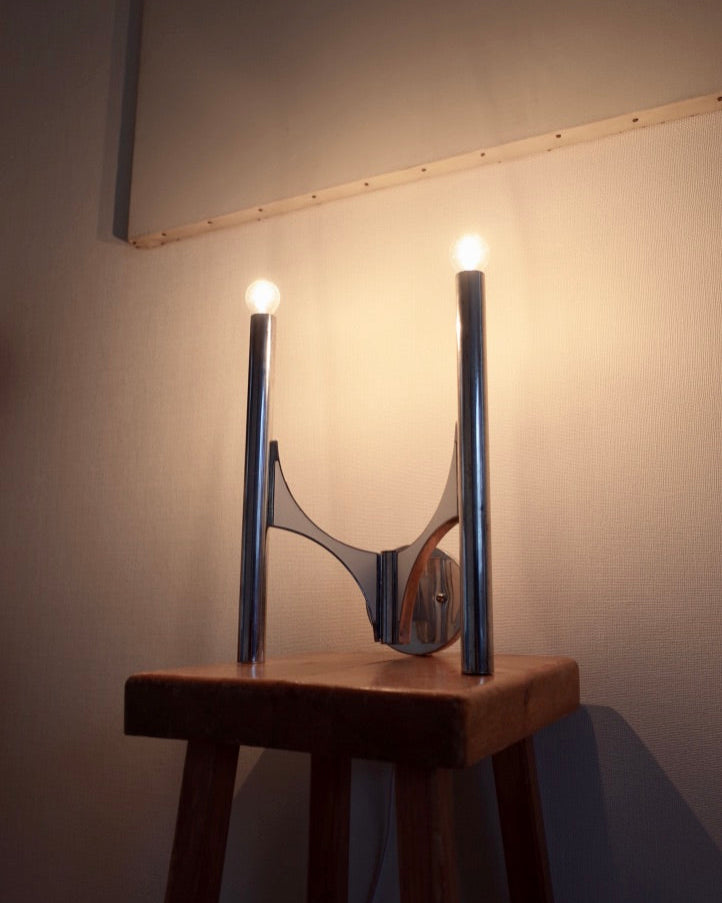 イタリアの名デザイナー Gaetano Sciolari による1970年代のウォールランプ「Model 105」ペアセット。クロームメッキ仕上げの真鍮製で、洗練された直線構造と幾何学的なバランスが特徴です。Sciolari特有のミニマルかつ未来的な造形は、当時のモダン建築やラグジュアリーインテリアに広く採用されました。