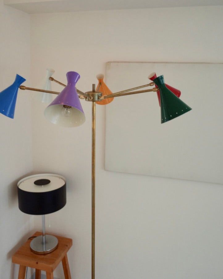 真鍮の支柱と大理石ベースを組み合わせた上質な構造に、マルチカラーのシェードが華やかさを添えています。各シェードは可動式で、光の向きを自在に調整可能。