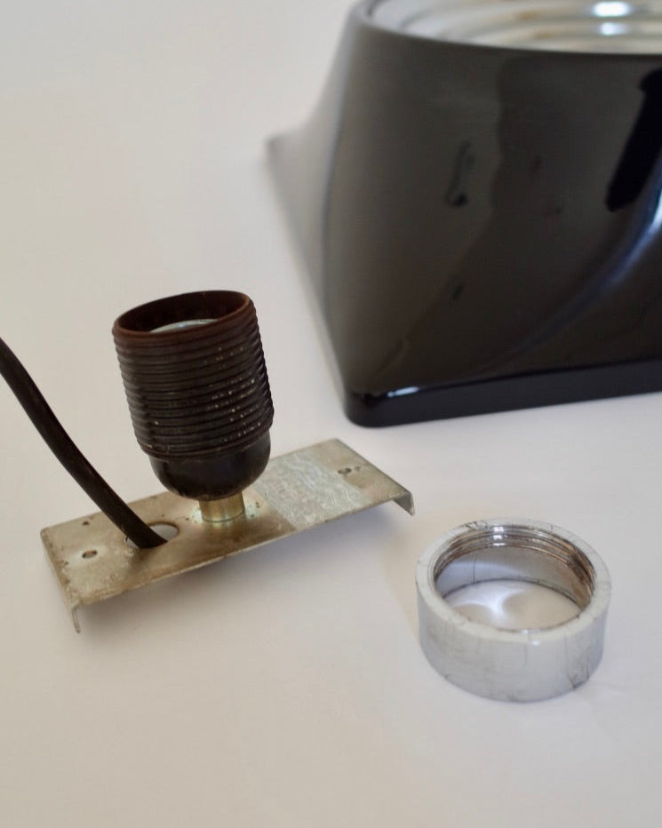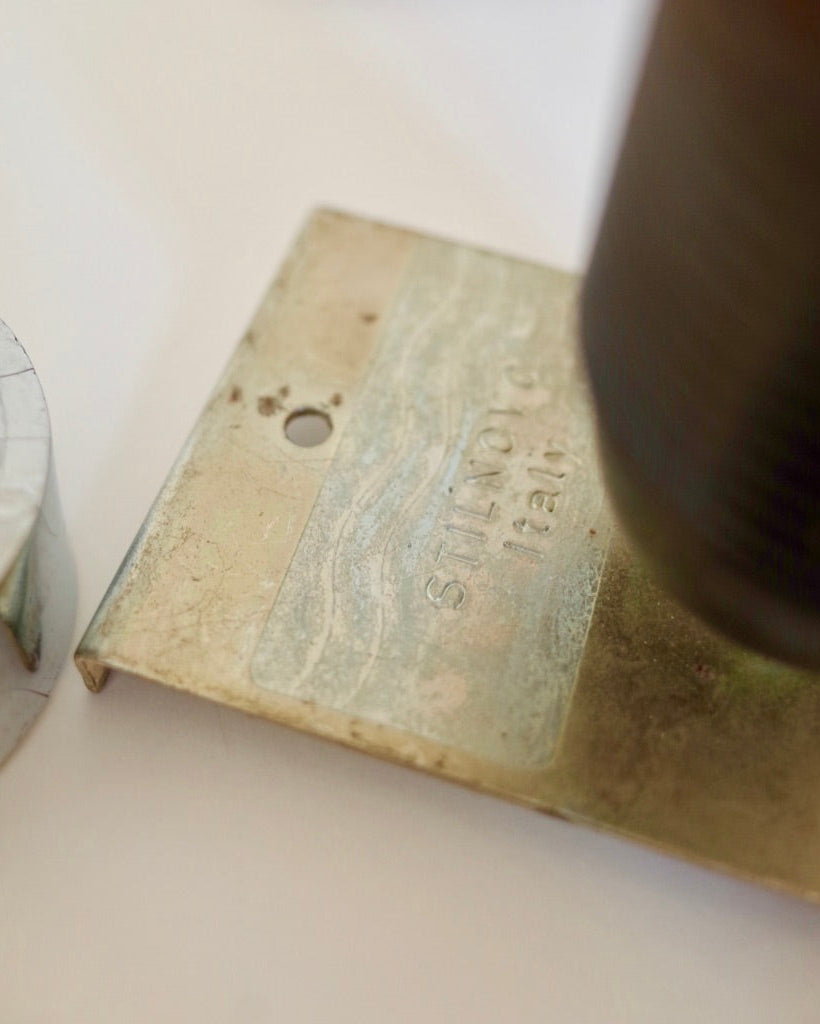 The main body is constructed with a black resin support combined with a chrome metal reflective disc, and has the original "Stilnovo Italia" engraving on the back.