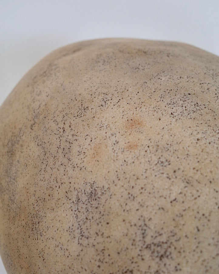 ガラスファイバーと大理石の粉を混ぜた素材で成形され、点灯すると柔らかく温かみのある光を放ち、空間に彫刻的な存在感を与えます。
