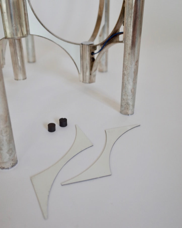 本作 Model 105(1970年代製)は、Sciolariが幾何学的構造と素材の反射効果を巧みに活かした代表的なシリーズのひとつ。円形に配置されたチューブ状のアームは、クローム仕上げによってミラーのように光を映し出し、建築的なリズムと光の陰影を生み出します。これは、同時代に活躍した Stilnovo や Arredoluce の洗練された機能主義とは一線を画し、彫刻的かつ演劇的な要素を強く持つ点で際立っています。