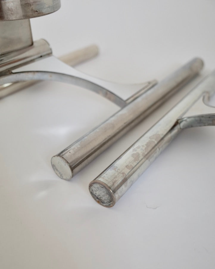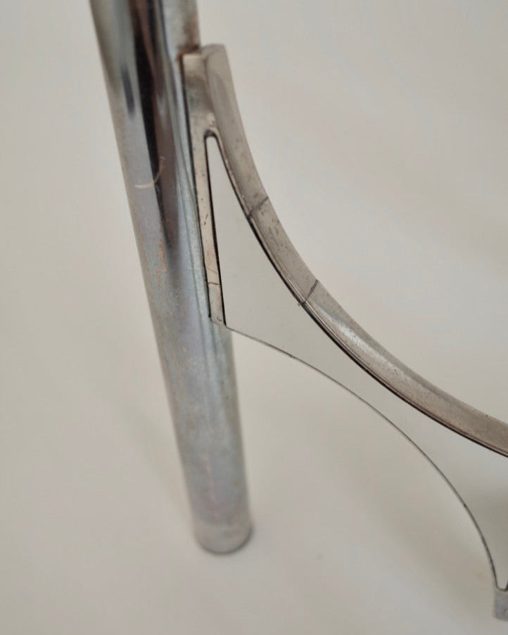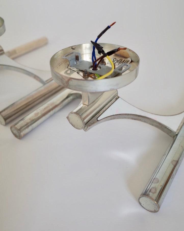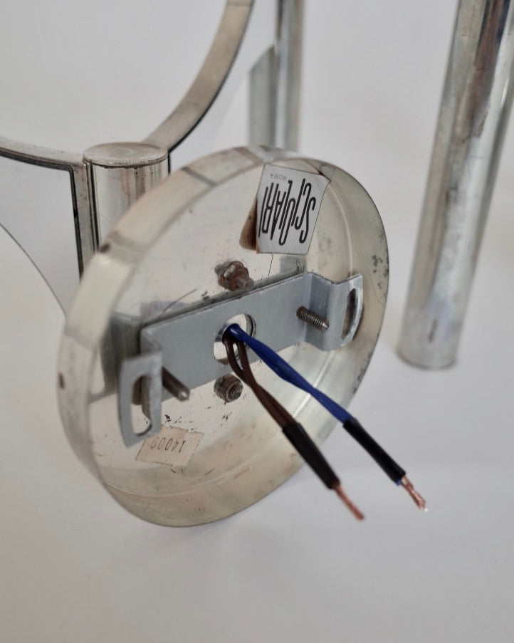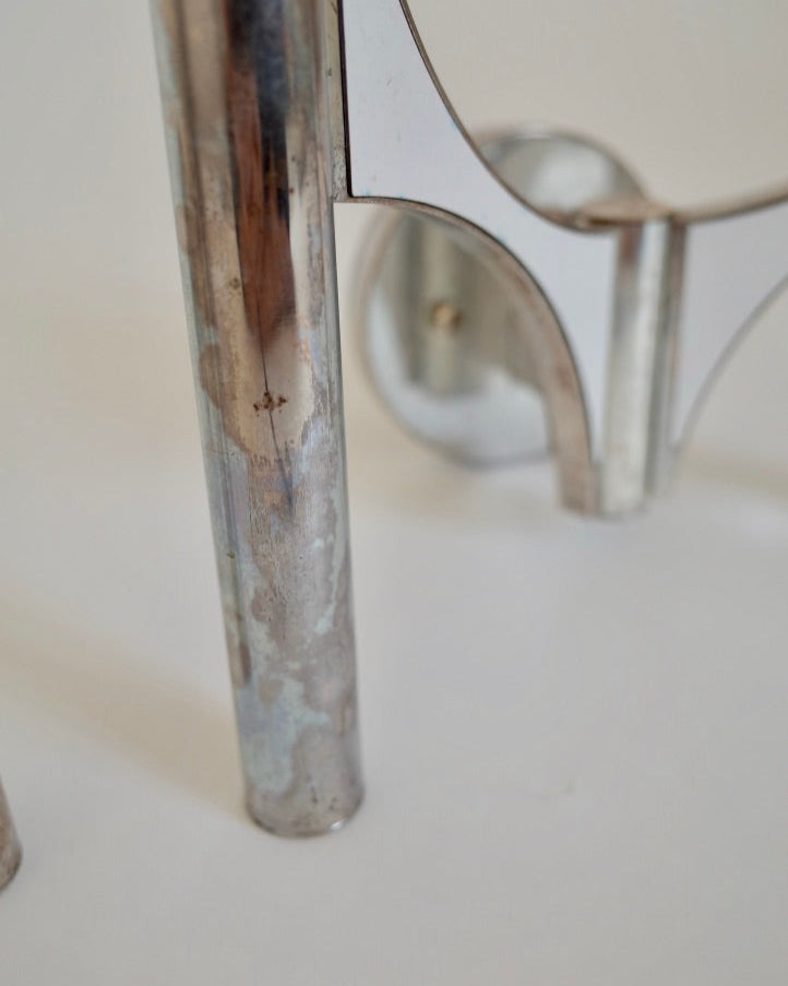 イタリアの名デザイナー Gaetano Sciolari による1970年代のウォールランプ「Model 105」ペアセット。クロームメッキ仕上げの真鍮製で、洗練された直線構造と幾何学的なバランスが特徴です。Sciolari特有のミニマルかつ未来的な造形は、当時のモダン建築やラグジュアリーインテリアに広く採用されました。