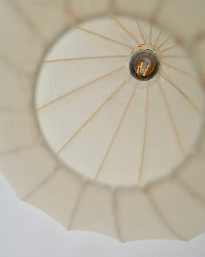 この製法は1950年代にアメリカのGeorge Nelson(ジョージ・ネルソン)が初めて取り入れたもので、その後ヨーロッパ各地のメーカーが採用しました。中でもGoldkant Leuchten社の作品は、しっかりとしたフレームと均一なファイバーコーティングによって高い完成度を誇ります。
