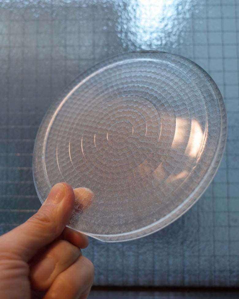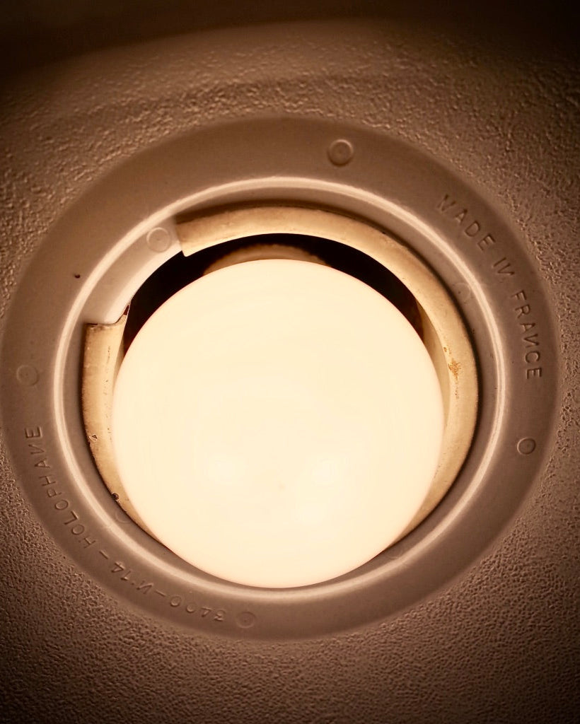 下向きの半球型シェードに、オリジナルの2パーツ構成のプリズマティック・ガラスレンズが備わり、上部はパンチング加工が施されたコニカル(円錐形)スチールステムによって吊り下げられています。